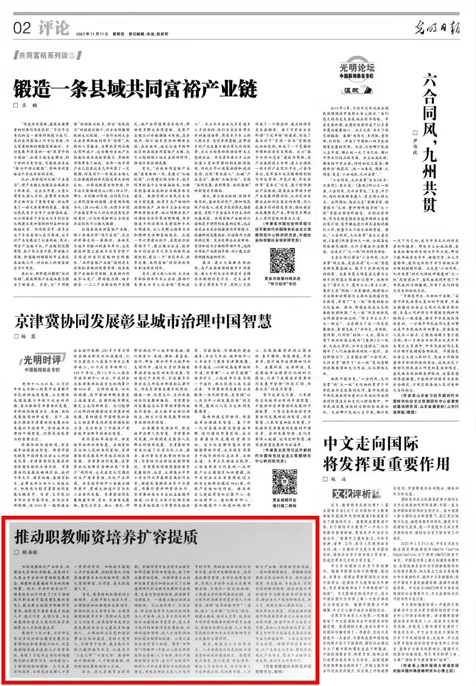 2021年11月11日,《光明日报》第2版评论版刊发了校党委书记赖海榕教授署名文章《推动职教师资培养扩容提质》。