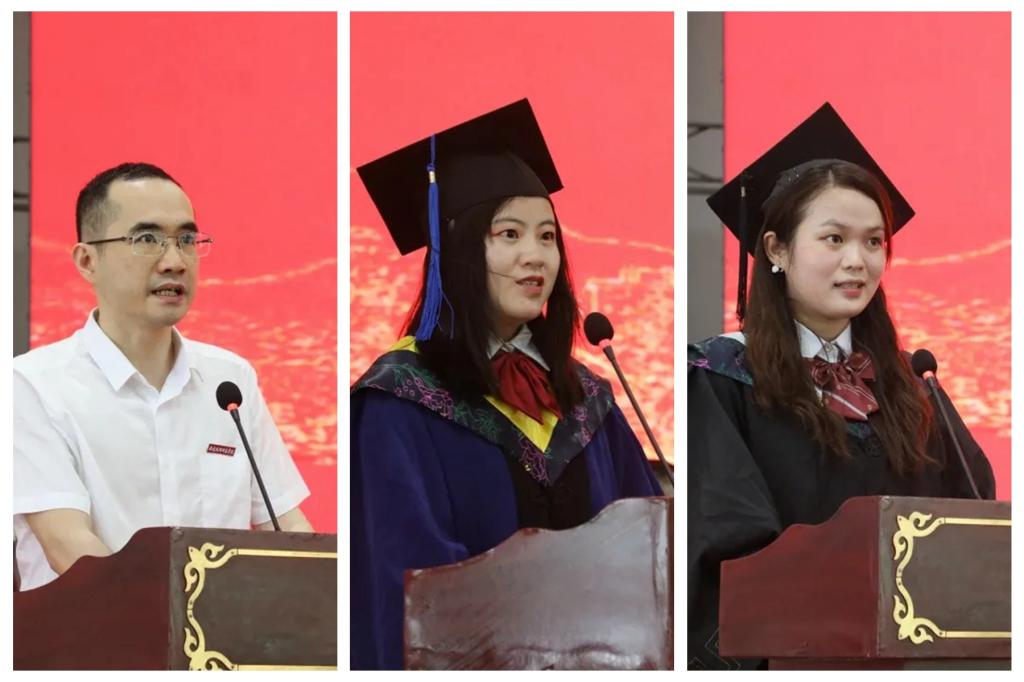 教师代表、文化传媒与法律学院副教授江悦庭,本科毕业生代表、2018级财务管理专业叶美惠,硕士毕业生代表、2019级食品生物化学工程专业陈锦阳分别作了热情洋溢的发言。