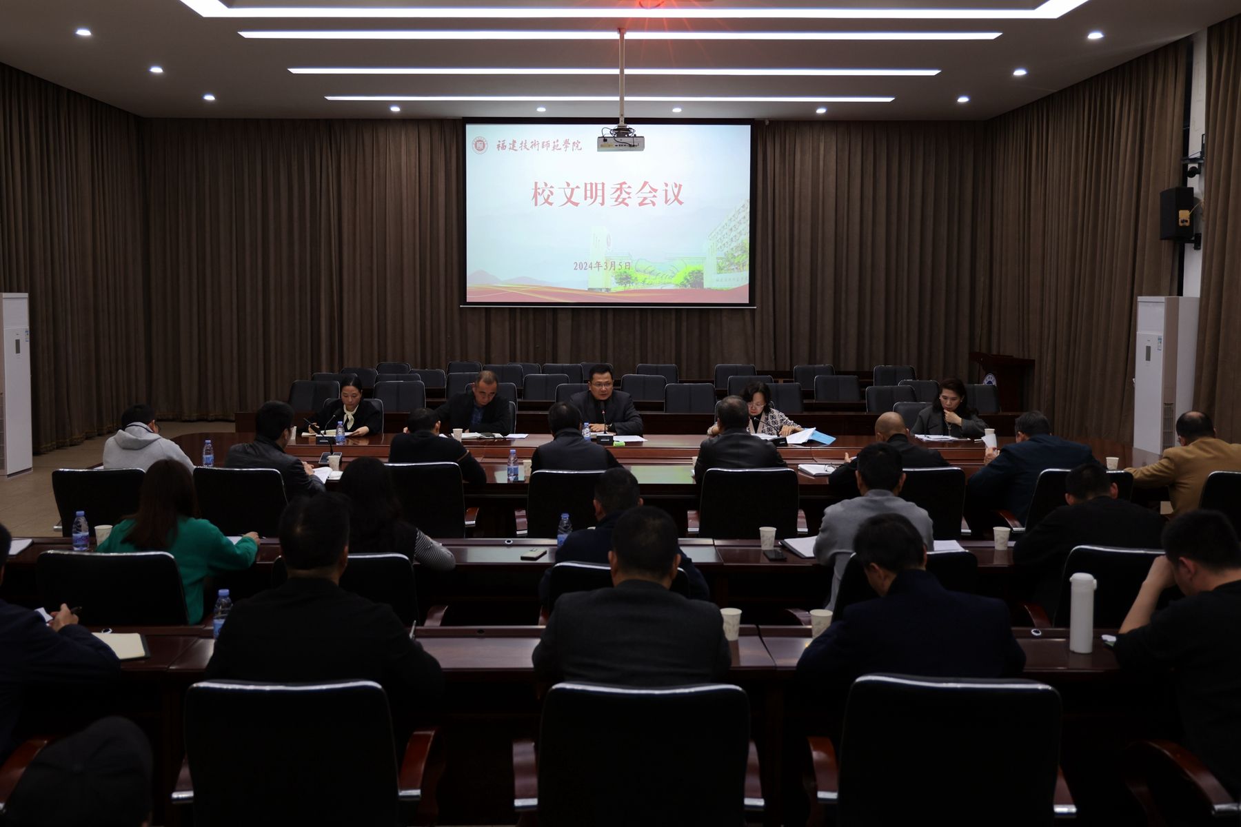 3月5日下午,我校在图书馆学术报告厅召开校文明委会议,校党委副书记林海峰出席会议并作了讲话,机关各单位、教辅单位负责人,各二级学院党组织负责人参加了会议。