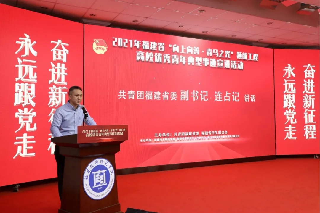 12月15日,由共青团福建省委、福建省学生联合会主办的2021年福建省“向上向善·青马之光”领航工程高校优秀青年典型事迹宣讲活动在我校举办。团省委副书记连占记,厦门市临家商务服务集团有限公司董事长、我校客座教授邱尚振,临家餐饮教育中心院长李娜,校党委副书记林海峰、副校长陈志勇,团省委学校部、福清市团市委负责人,以及我校改革与发展委员会成员、宣传部、学生工作部、教师工作部、校团委和各学院团委负责人,福州大学、福建师范大学、福建农林大学、闽江学院和我校的青年代表参加了活动。