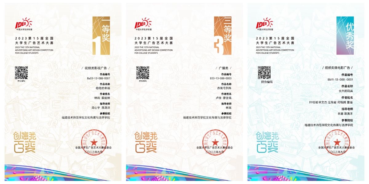 获得全国一等奖的作品为《稳稳的幸福》,作者为2022级广播电视编导专业林莉、蔡婉婷,指导老师为郑心宇、蒋潇洋;获得全国三等奖的作品为《赤尾号列车》,作者为2020级网络与新媒体专业卢佳、广播电视编导专业廖圣铭,指导老师为林嵩;获得全国优秀奖的作品为《长大的玩具》,作者为2021级广播电视编导专业叶相诚、林文杰、庄怡君、童谣和2022级网络与新媒体专升本专业何祺鹏,指导老师为林嵩、蒋潇洋。大学生广告艺术大赛是目前全国规模大、覆盖高等院校广、参与师生人数多、作品水准高的国家级大学生学科和技能竞赛A类赛事。在第十五届全国大学生广告艺术大赛上,我省高校仅3件作品获得一等奖。我校高度重视应用型人才培养,倡导“以赛促教 以赛促学”等教学模式改革,激励师生参加各类学科专业竞赛。艺术与传媒学院、文化与法律学院、大数据与人工智能学院和材料与包装工程学院等积极组织师生参与第十五届全国大学生广告艺术大赛。全校共有1116件作品参加校赛、93件作品在福建赛区中获奖,其中一等奖2项、二等奖3项、三等奖23项、优秀奖65项。(艺术与传媒学院)